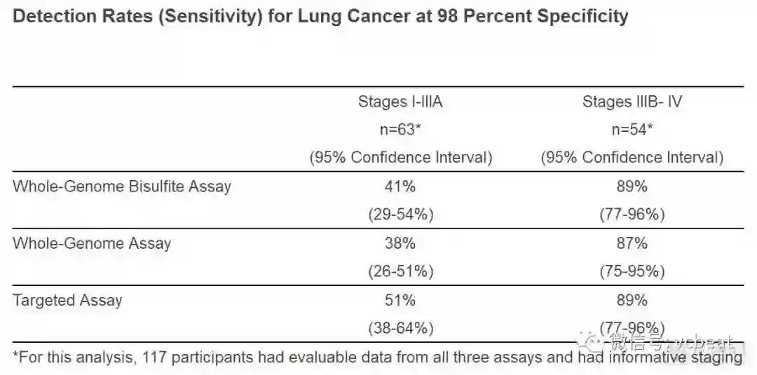 结果表明,在早期(I-IIIA期)肺癌患者中,检测率为38%~51%(98%特异性);在晚期肺癌(IIIB-IV期)患者中,检测率为87%~89%,具体如下表所示: