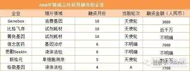2018年成立的Genebox也获得了来自大参林(个人投资)3600万人民币的天使轮融资。其创始人李智曾在华平投资担任VP,在瑞银投资银行香港办公室担任副董事。