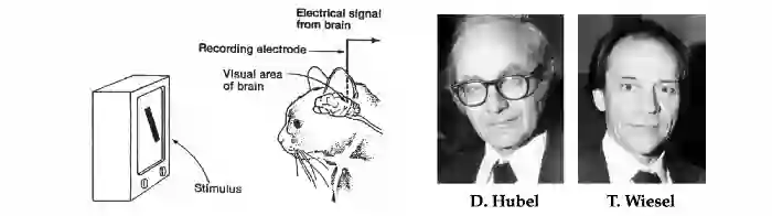 在一系列后来成为经典并夺得诺贝尔医学奖的实验中,哈佛大学的神经生理学家David Hubel和Torsten Wiesel共同揭开了大脑中负责模式识别的一部分,即视觉皮层的结构和功能。
