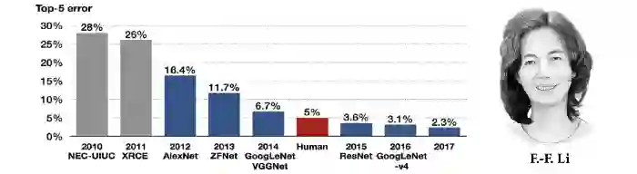由美籍华人研究员李飞飞在2009年建立的ImageNet数据集,并随之举办的大规模视觉识别挑战赛在当时的计算机视觉领域掀起深度学习浪潮,其中包括数以百万计的人类标记的图像,参赛模型需要将其分为1000个不同类别。