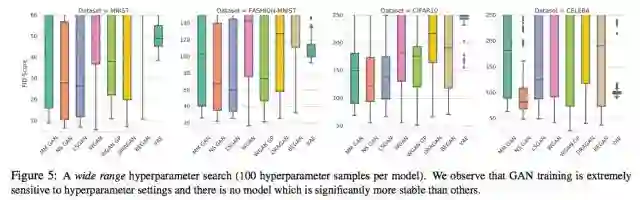 图5:大范围超参数搜索(每个模型100个超参数样本)。我们观察到,GAN训练对超参数设置是非常敏感的,没有特别稳定的模型。