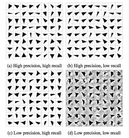 我们这个简单的三角形数据集使我们能够计算很好理解的精度和召回指标,从而得出F₁ score。我们观察到,即使对于这个看起来很简单的任务,许多模型也很难获得高的F₁得分。在提高F₁ 得分时,NS GAN和WGAN同时有高精度和高召回率。其他的模型,例如DRAGAN和WGAN GP未能达到高召回值。最后,我们观察到在这个任务上可以实现高精度和高召回率(参见附录E)。