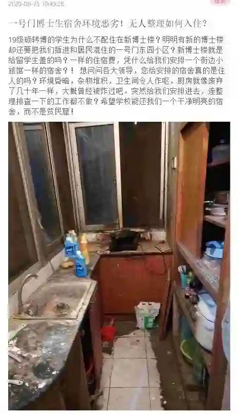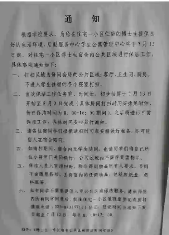 不过好在,学校后勤处很快注意到了网上的舆情,也迅速的给出了解决方法。将派专人对博士生学生公寓进行打扫,为在小区住宿的博士生提供良好的生活环境。