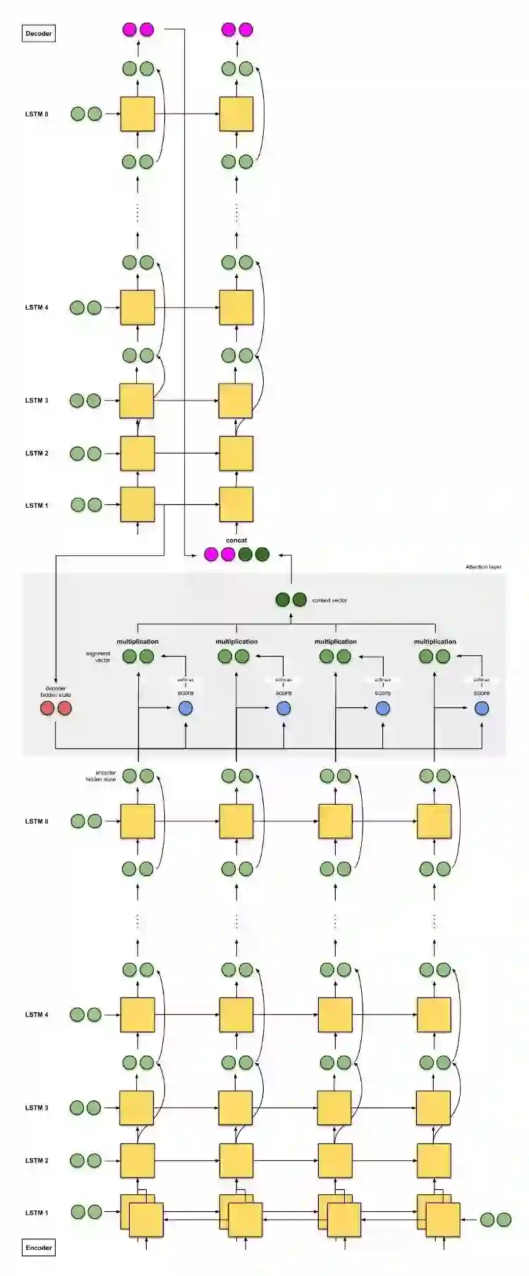 谷歌的神经机器翻译:带8个堆叠编码器的seq2seq(+双向+剩余连接)+注意力