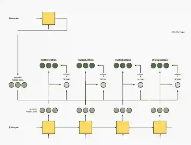 该机制下会为每个单词分配一个得分,根据分数高低投入不同的注意力。然后根据Softmax函数处理过的分数,使用编码器隐藏状态的加权和来聚合编码器隐藏状态,获得上下文向量。注意力层的实现可以分为4个步骤。
