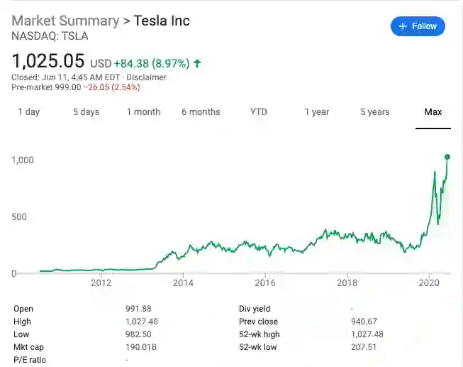昨天美股收盘,特斯拉股价再创新高,收于 1025 美元/股,股价市值突破 1800 亿美元,这让它超越丰田,首次成为全球市值最高的车企。