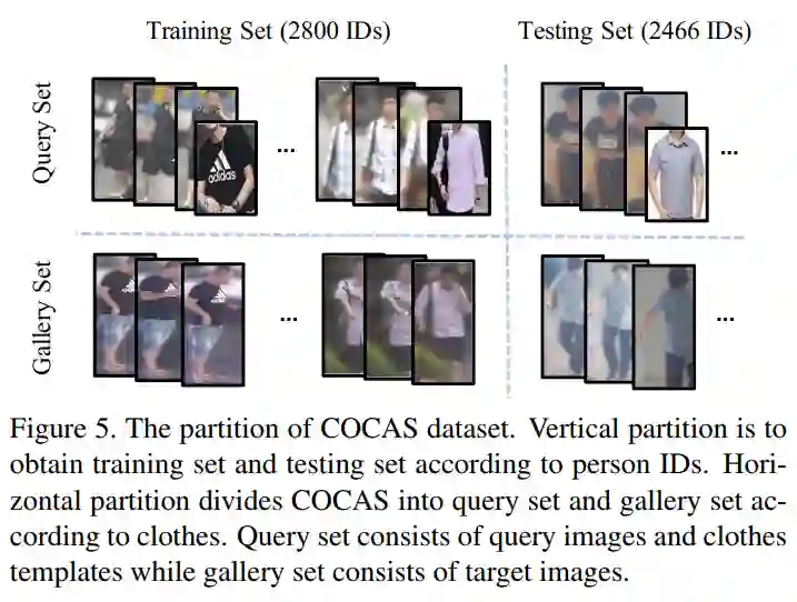COCAS 包含5266人的62382幅人体图像,旨在解决换衣服的行人重识别问题,提供了具有不同衣服的相同身份的多个图像,并提出BC-Net网络。