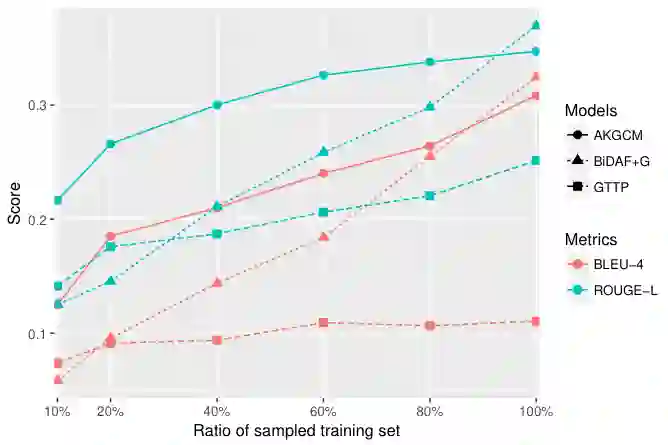 最后,论文还通过减小训练数据集的规模来分析各模型在小规模语料上的泛化能力,实验结果如图3所示,不难发现,AKGCM模型在超小规模训练数据集上的效果要显著地优于其他模型,这说明带有结构信息的扩充知识图为AKGCM模型带来了较强的泛化能力。