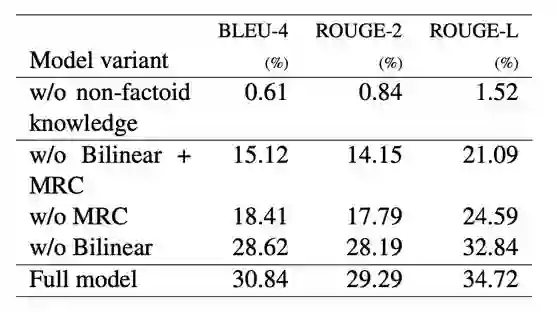 此外,为了探究AKGCM模型中各个模块对整体效果的影响,论文还做了模型简化测试(Ablation Study),实验结果如表3所示。其中,w/o non-factoid knowledge 表示知识选择时,不使用非结构化文本知识;w/o Bilinear表示知识选择时,不使用双线性函数提取的输入消息和候选顶点间的相关性特征;w/o MRC 表示知识选择时,不使用机器阅读理解技术提取的输入消息和候选顶点间的细粒度语义匹配特征。可以发现,机器阅读理解技术的引入,对模型整体效果的提升比较显著。