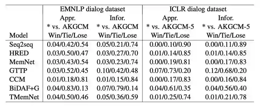 人工评估上,论文采用了合适度(Appr.)和丰富度(Infor.)两个指标对所有基线模型同AKGCM模型做对比评估。表1