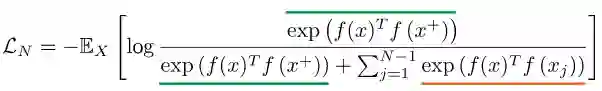 分母项由一个正样本和N - 1个负样本组成。这里我们使用点积作为score函数: