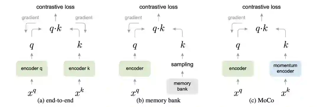 对比方法在有更多的负样本的情况下效果更好,因为假定更多的负样本可以更有效地覆盖底层分布,从而给出更好的训练信号。在通常的对比学习公式中,梯度流通过编码器的正样本和负样本。这意味着正样本的数量被限制在mini-batch的尺寸上。动量对比(MoCo,He et al., 2019)通过维持一个大的负样本队列,并且不使用反向传播来更新负编码器,有效地绕过了这个问题。相反,它定期更新负编码器使用动量更新: