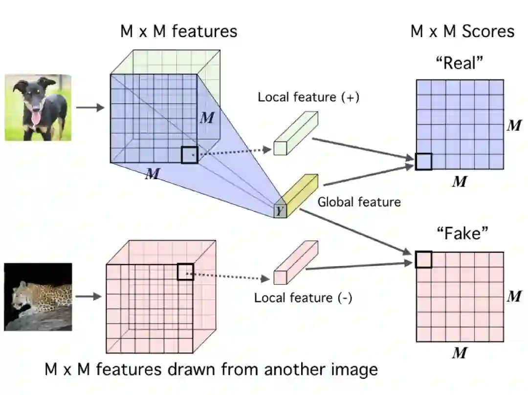 Deep InfoMax (DIM, Hjelm等人,2018)通过利用图像中的本地结构来学习图像的表示。DIM的对比任务是区分全局特征和局部特征是否来自同一幅图像。在这里,全局特征是卷积编码器的最终输出(一个平面向量,Y),局部特征是编码器中间层(一个M x M特征图)的一个输出。每个局部特征图都有一个有限的感受野。所以,直观上,这意味着要做好对比任务全局特征向量必须从所有不同的局部区域中获取信息。