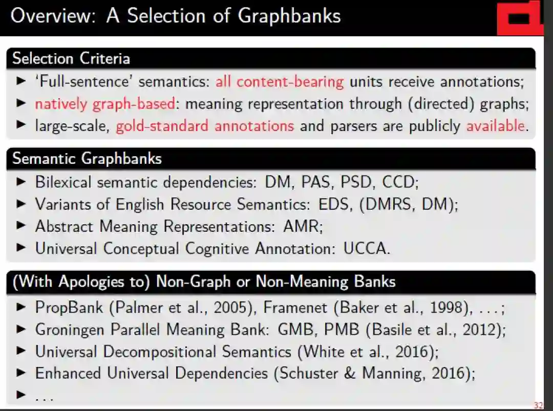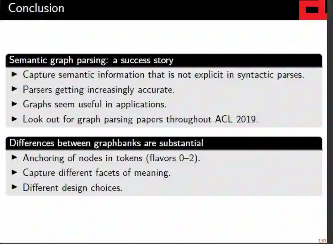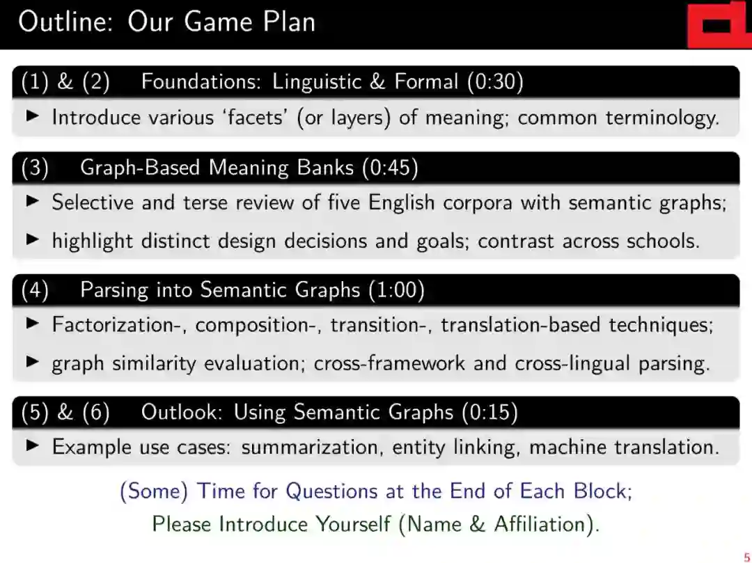 本教程的最终目标是对不同的语义图库和相关的解析工作提供一个统一的视角,从而为刚入行的NLP开发人员和用户扫清障碍,并从这个令人兴奋的领域的最新技术和最佳实践中获益。
