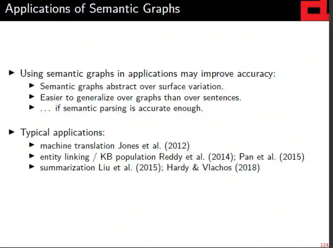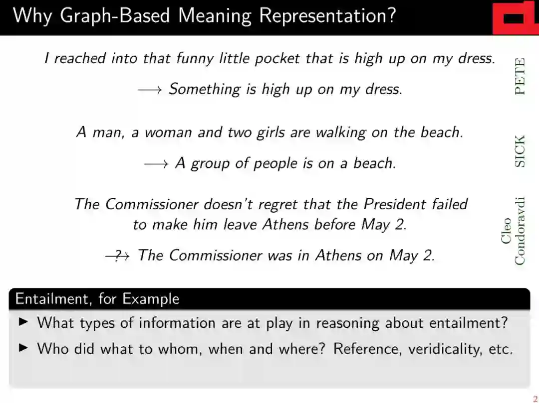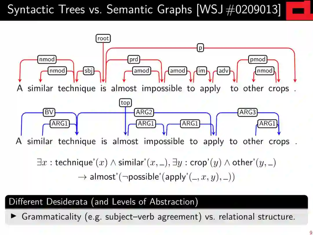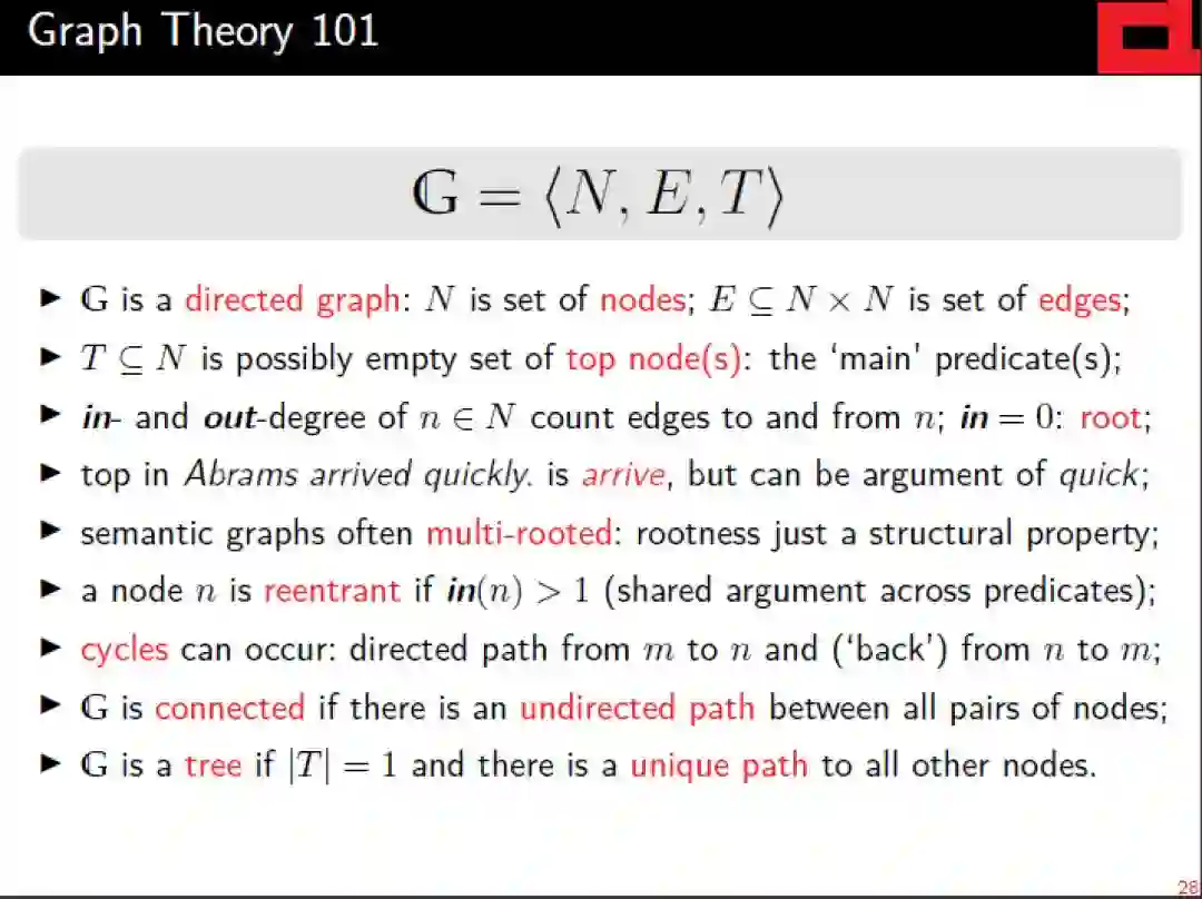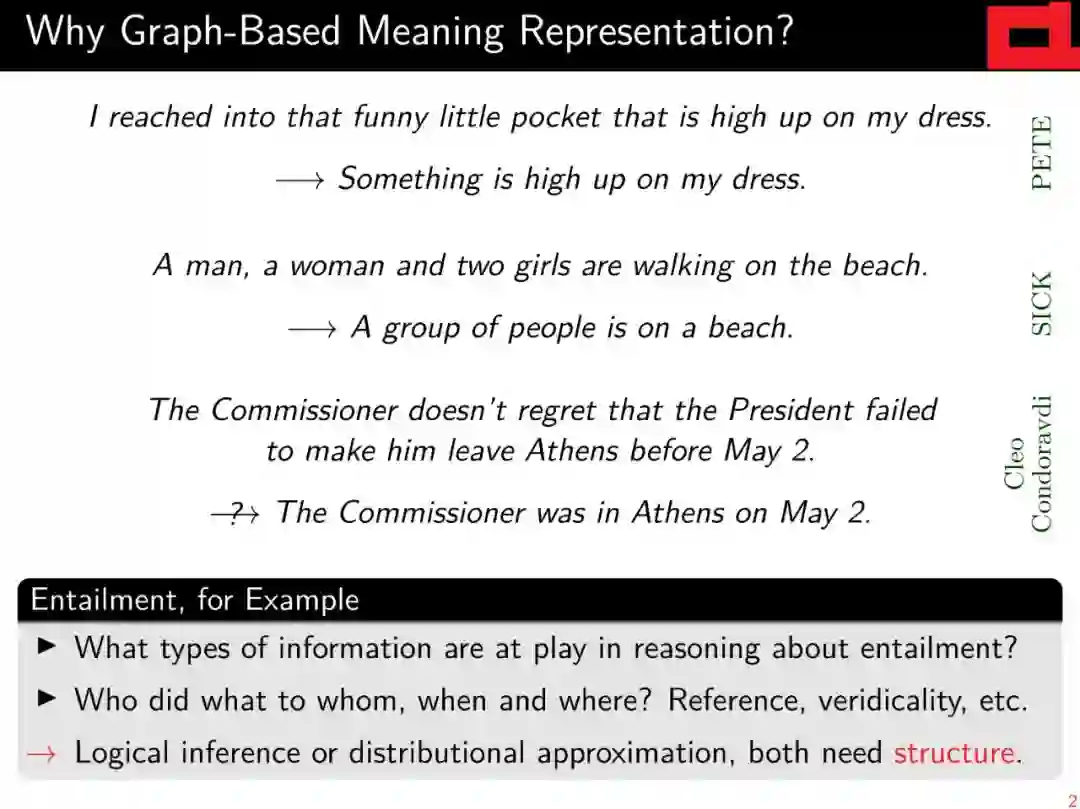 作为对基于向量的高级语义表示的补充,对这种层次结构和离散语义表示的解析自早期以来一直是自然语言理解的基石,并将继续为自然语言的“有意义”做出重要贡献。本教程将(a)简要回顾formal语义学和linguistic语义学的相关背景;(b)对语义图的不同风格和相关术语半正式地定义统一的抽象观点; (c)综述基于图的意思表征的共同框架和现有的图库;(d) 从技术角度介绍如何选择不同的具有代表性的解析方法。