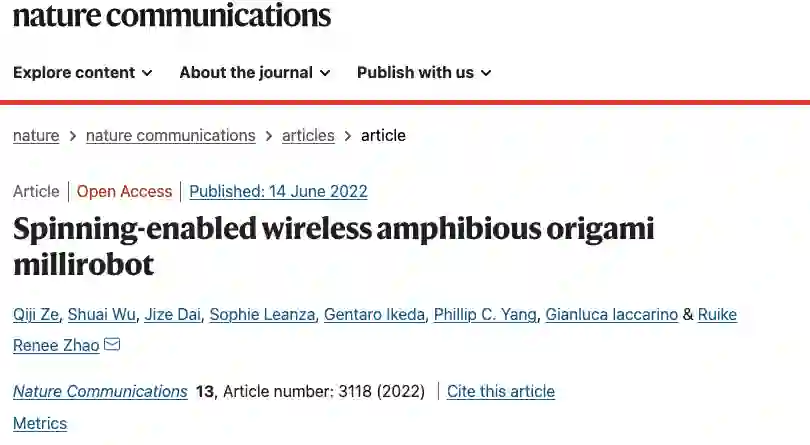 相关研究论文以“Spinning-enabled wireless amphibious origami millirobot”为题,发表在科学期刊《自然-通讯》(Nature Communications)上。