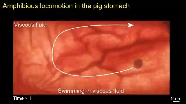 而且,新型毫米级折纸机器人无论是在水上、水面和水下,还是在充满粘液的猪胃内,都可以正常工作。