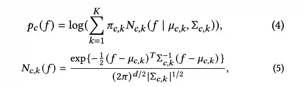 为了缓解传统单质心的表示能力的不足,我们使用高斯混合模型来代替传统的单质心模型如图 3 所示。高斯混合模型的对数概率密度由如下公式得出:
