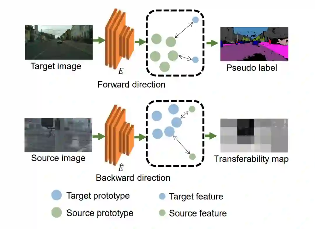 双向的思想如图所示。它包括一个“前向过程”——利用源域原型在目标域内选择可靠的伪标签;一个互补的“反向过程”——利用目标域原型对源域的困难样本或干扰性样本进行“降级”。