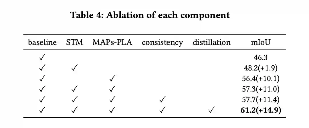 在预训练阶段,源域可迁移图(STM)的引入相比 baseline 带来了 1.9 的性能增益,自训练阶段多重各向异性原型带来了 9.1 的性能提升。综合一致性正则和蒸馏技术,最终的性能达到了 61.2.