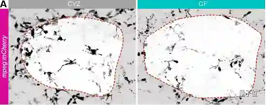 通过观察,他们发现的确无菌处理后(GF组)小鱼脑内小胶质细胞比对照组更少: