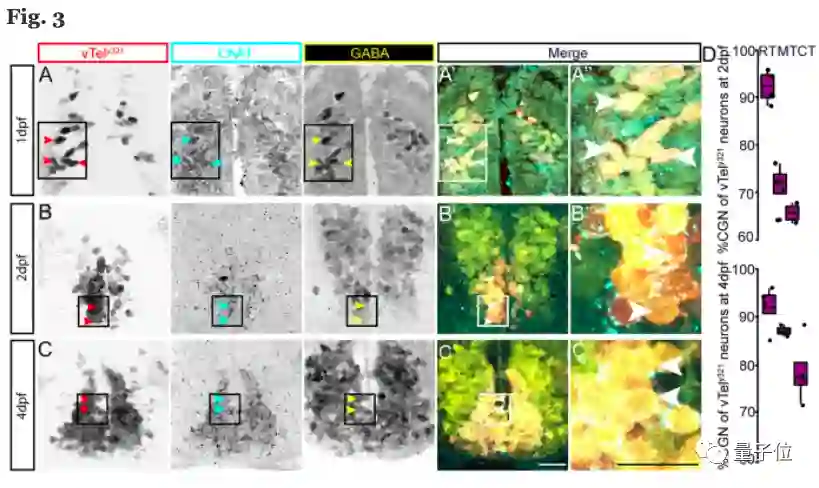 下图中,第一列为斑马鱼vTely321神经元在胚胎发育中的表达情况,二三列为小鼠两种CGN神经元的表达情况,科学家以标记方式观察,发现了高度相似:
