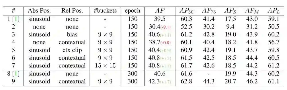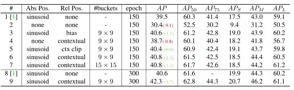 2)在图像分类任务中,相对位置编码可以代替绝对位置编码。然而,绝对位置编码对于目标检测任务是必须的,它需要用绝对位置编码来预测目标的位置。