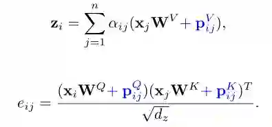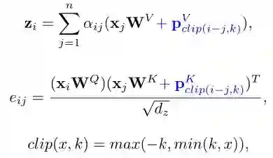 [1]提出一种Self-Attention的相对位置编码方法。输入token被建模为一个有向全连通图。每条边都代表两个位置之间的相对位置信息。此外,作者认为精确的相对位置信息在一定距离之外是无用的,因此引入了clip函数来减少参数量,公式表示如下: