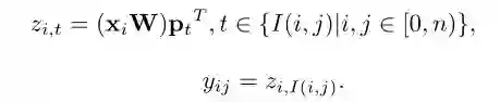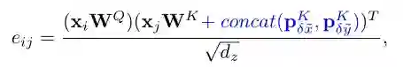 上面的相对位置编码都是针对一维的序列,[4]提出了一种对二维特征进行相对位置编码的方法,用公式表示如下: