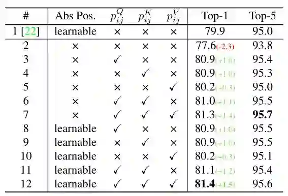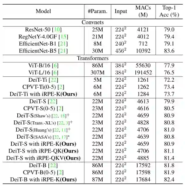 通过仅在key上添加相对位置编码,将DeiT-Ti/DeiT-S/DeiT-B模型分别提升了1.5%/1.0%/0.6%的性能。