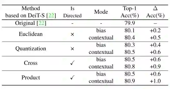 上表的结果表明了:1)无论使用哪种方法,Contextual模式都比Bias模式具有更好的性能。2)在视觉Transformer中,有向方法通常比无向方法表现更好。