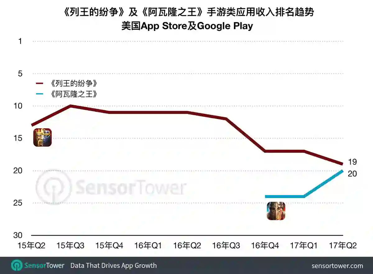 不过在过去两年时间里,《列王的纷争》和《阿瓦隆之王》在美国的表现非常出众。策略游戏《列王的纷争》自2014年底上线之后,虽排名并非直线上升,但过去两年以来每一季度(除上季度)均为美国手游综合收入前20名的唯一中国制造。