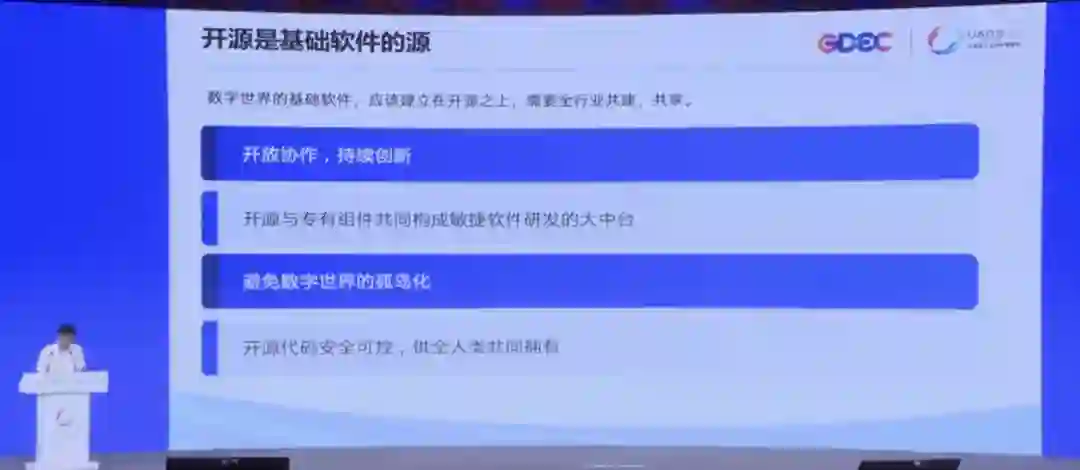 开源是基础软件的源头活水,数字世界的基础软件应该建设在开源上,需要全行业来共建共享。