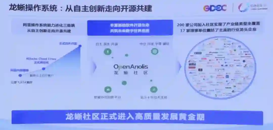 第三个案例是龙蜥操作系统。容器操作系统被定位是面向下一代、面向云的一个开源操作系统,借助阿里和云上客户的不断打磨和优化,目前已是一个非常成熟的开源社区。我们认为借助基于云+开源来支撑的数字化进程,这一确定性的趋势,以“三位一体”开源的模式去继续发展操作系统,能够让我们在云时代,不但能够补上基础软件领域的短板,而且有机会去实现跨越式的发展。