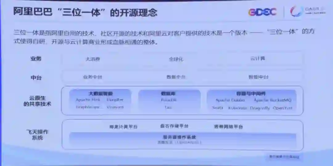 正是出于云+开源是数字世界的根这样一个认识,在阿里巴巴内部有一个“三位一体”的核心技术理念。“三位一体”是指阿里巴巴自己用的技术、社区开源的技术和阿里云对客户提供的技术,三个技术是一个版本。这种“三位一体”的方式,使得阿里巴巴的自研、开源和云上的商业形成了血脉相通的整体。