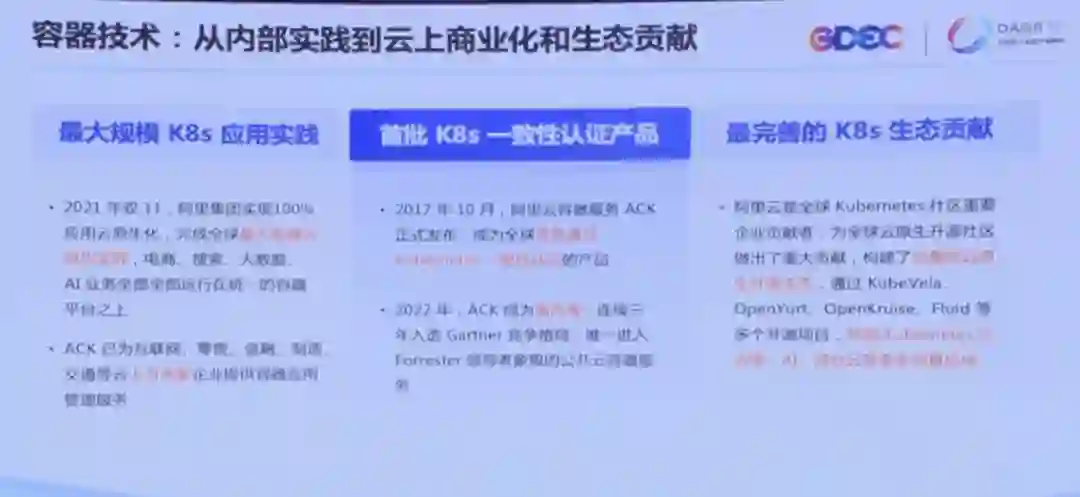 早在 2017 年,阿里巴巴在云上就上线了 ACK 阿里云的容器服务,并且成为业界首批通过 Kubernetes 一致性认证的产品。在参与社区上,阿里巴巴也依托自己的实践,给社区贡献了如 KubeVela、OpenYurt、OpenKruise、Fluid 等开源的项目,帮助 Kubernetes 可以向边缘云、向混合云、向多个场景做了有效的延伸。