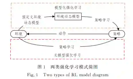 强化学习又称增强学习,在学术界对 RL与统计学、优化 理论和其他数学学科的互动研究有了突破后,RL 逐渐成为 了各 领 域 的 研 究 热 点[1]. 随 着 深 度 学 习 (DeepLearning, DL)[2]的兴 起,融 合 深 度 神 经 网 络 和 RL 的 深 度 强 化 学 习 (DeepReinforcementLearning,DRL)[3]技术的研究和应用日 益增多. RL是一种不同于监督学习的学习方式.监督学习通过 外部提供的标注数据集进行学习,每一个样本都是训练中的 “监督者”[4].而 RL中并不存在这样的“监督者”,因此 RL提 出了奖励信号这个概念.它与监督学习中的监督信号不同, 为了考虑智能体(agent)整体的累积收益,它是 被 延 迟 反 馈 的.同时,监督学习的训练数据之间一般是独立的,而 RL处 理的是序贯决策问题,每一步在顺序上都具有依赖关系. RL也是一种不同于无监督学习的学习方式.无监督学 习的主要目标是寻找未标注数据集中隐含的结构关系,而 RL 的目标是最大化累积收益.同时,无监督学习没有 RL 的奖 励信号,其数据之间一般也是独立的. 在实际应用中,根据agent是否通过与环境交互获得的 数据来预定义环境动态模型,将 RL 分为模型化强化学习和 无模型强化学习[5],具体如图1所示.