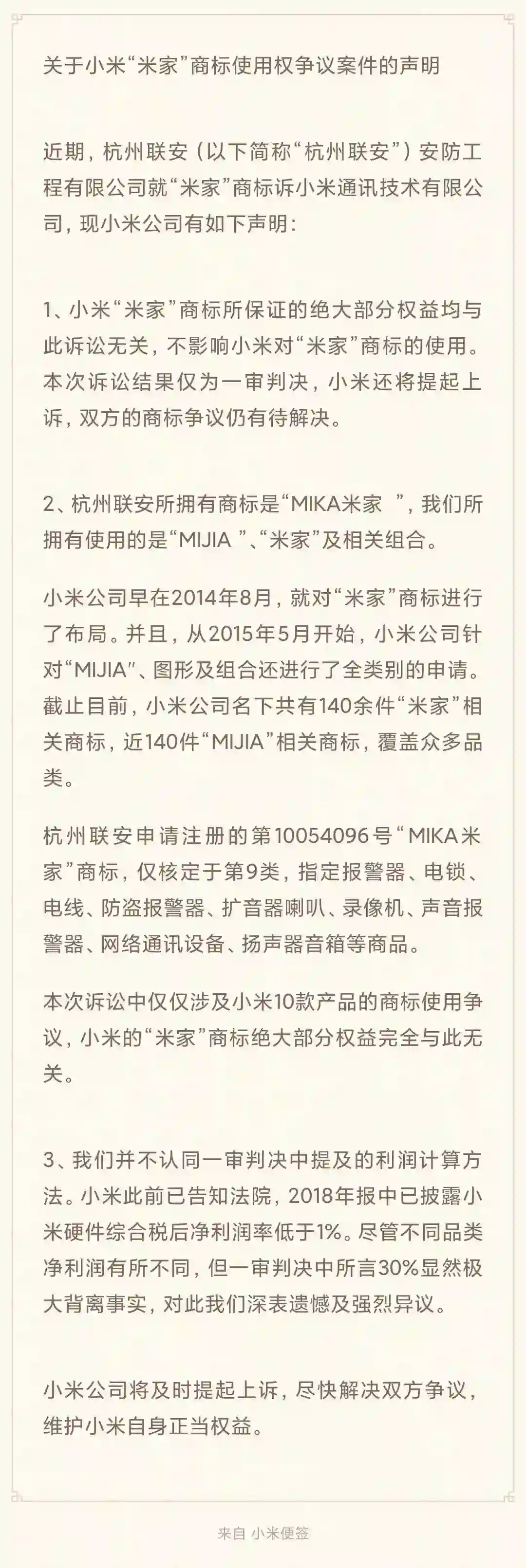 小米回应“米家”商标争议:不影响商标使用,将提起上诉