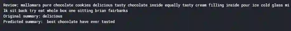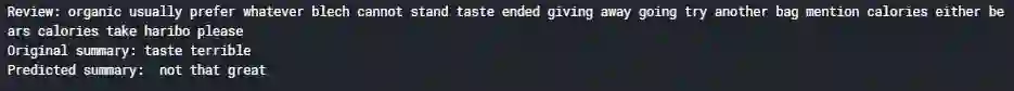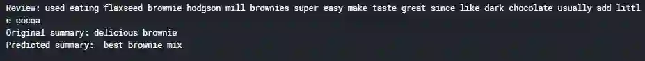 这真的很酷。即使我们模型生成的摘要和实际摘要并不完全匹配,但它们都传达了相同的含义。我们的模型能够根据文本中的上下文生成清晰的摘要。
