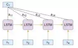 参与的上下文向量C1由编码器隐藏状态hj和对齐分数a1j的乘积的线性和导出: