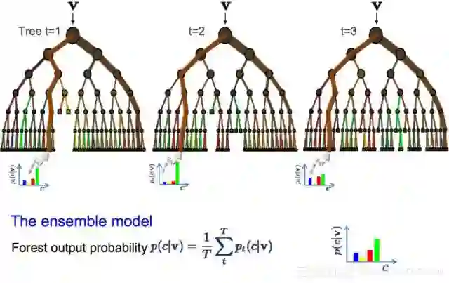 在Bagging中,可以用上述相同的方法估计整个数据模型,最常见的是决策树。选取训练数据中的多个样本,然后构建模型。当你需要预测新数据时,每个模型都会做出预测,取平均值后以便更好地估计真实输出值。