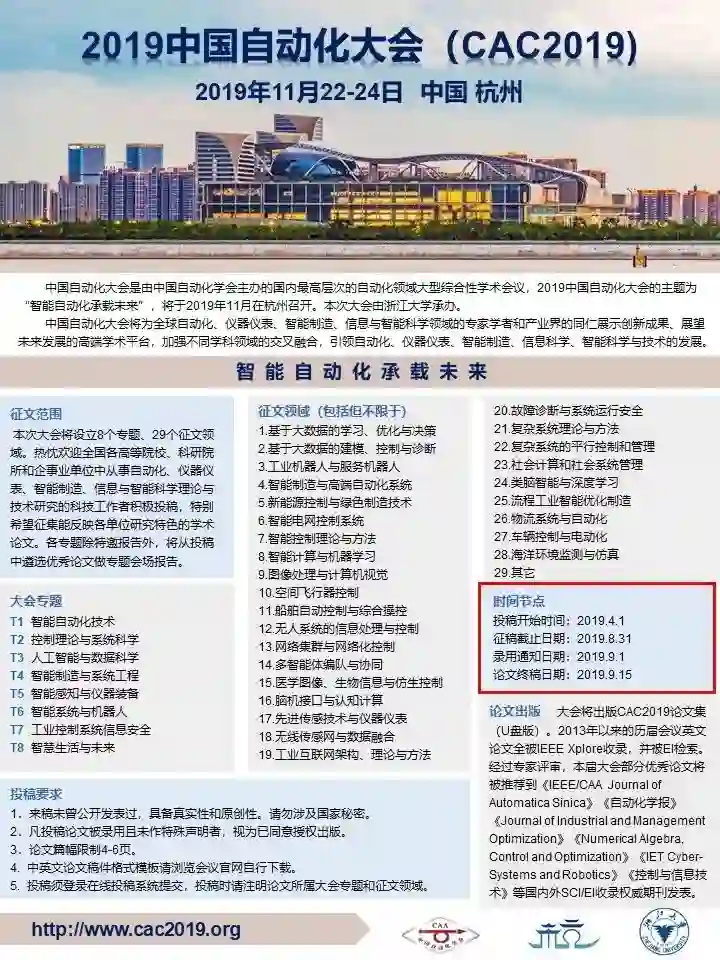 【导读】中国自动化大会是由中国自动化学会主办的国内最高层次的自动化领域大型综合性学术会议,2019中国自动化大会的主题为“智能自动化承载未来”,将于2019年11月22-24日在杭州召开。本次大会由浙江大学承办。应广大作者要求,现征稿截止时间延至2019年8月31日,请各位投稿人周知,欢迎踊跃投稿。