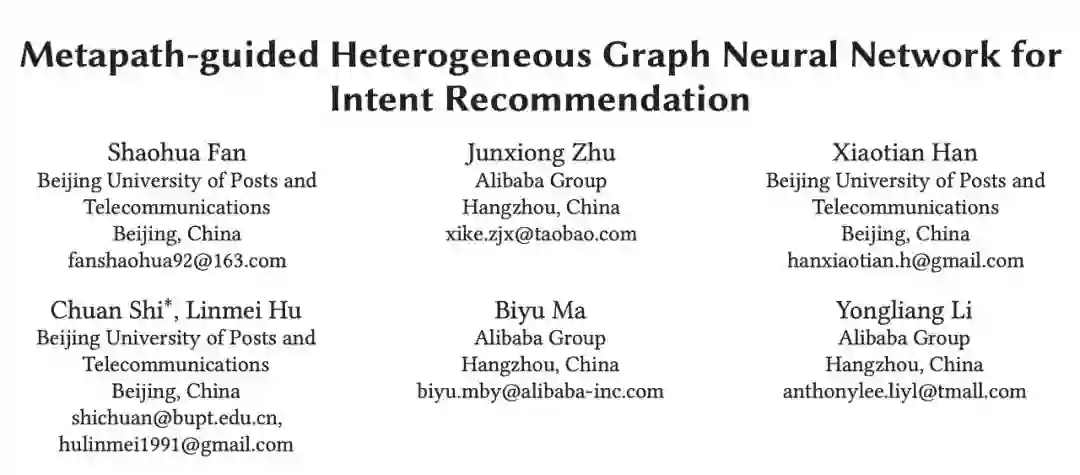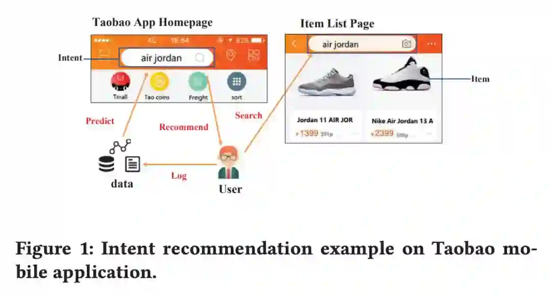 本文由北京邮电大学联合阿里巴巴发表在 KDD 2019, 是异质图神经网络在推荐中的应用。针对淘宝业务的实际需求,本文将 Intent Recommendation 场景建模为⼀个大规模异质图,并提出了⼀种基于异质图神经网络的推荐算法 MEIRec。作者也给出了⼀个 Intent Recommendation 的例⼦,⻅下图: