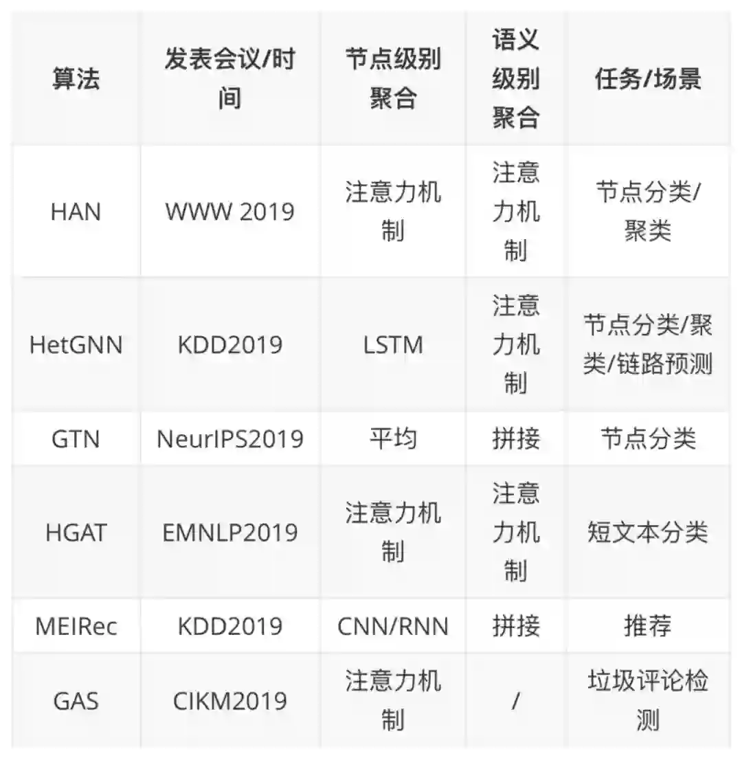 图神经网络已经成为深度学习领域的热⻔研究⽅向之⼀。作为真实⽣活中⼴泛存在的异质图,其相应的异质图神经网络具有更⾼的实际研究价值。下⾯通过⼀个表格来对⽐本文所整理所有算法。