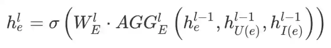 这里,l 代表聚合的层数,U(e) 和 I(e) 分别代表这条边 e 两端的 User 和 Item。