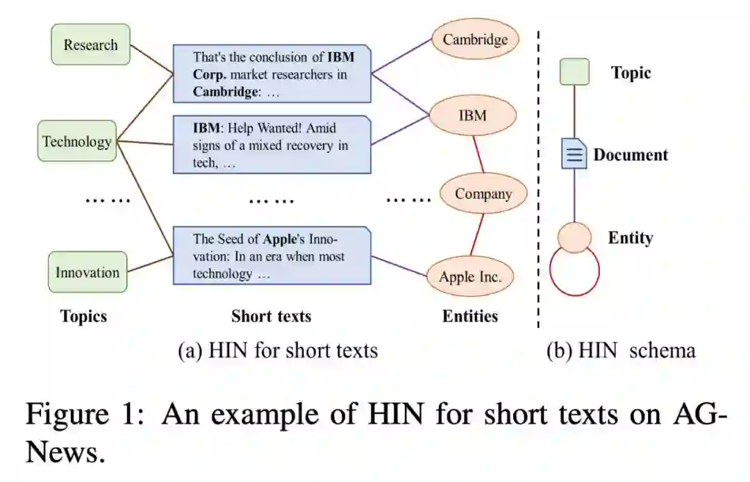 针对短文本分类的稀疏/歧义和标签稀缺问题,通过将其建模为异质图来解决数据稀疏和歧义带来的挑战。下图是作者在 AG-News 数据上建⽴的异质图。