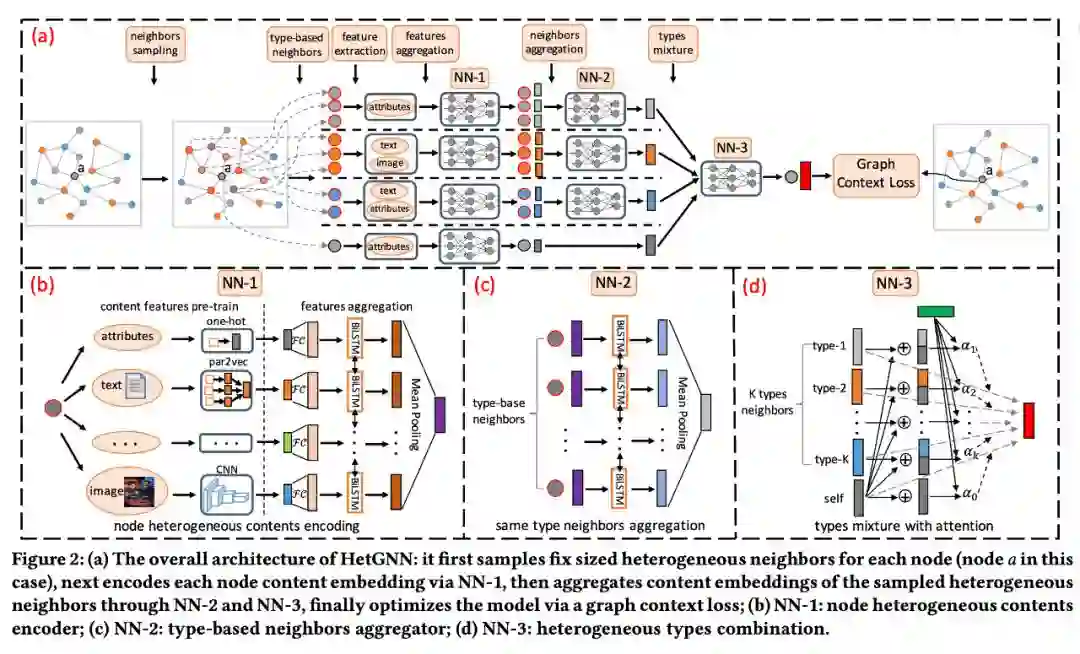 本文与上篇 Heterogeneous Graph Attention Network 名字仅有⼀字之差,发表时间也仅仅相差 3 个⽉。Heterogeneous Graph Neural Network (HetGNN) 也遵循异质图神经网络的层次聚合⽅式,只是聚合器的设计略有不同。数据集和代码⻅: