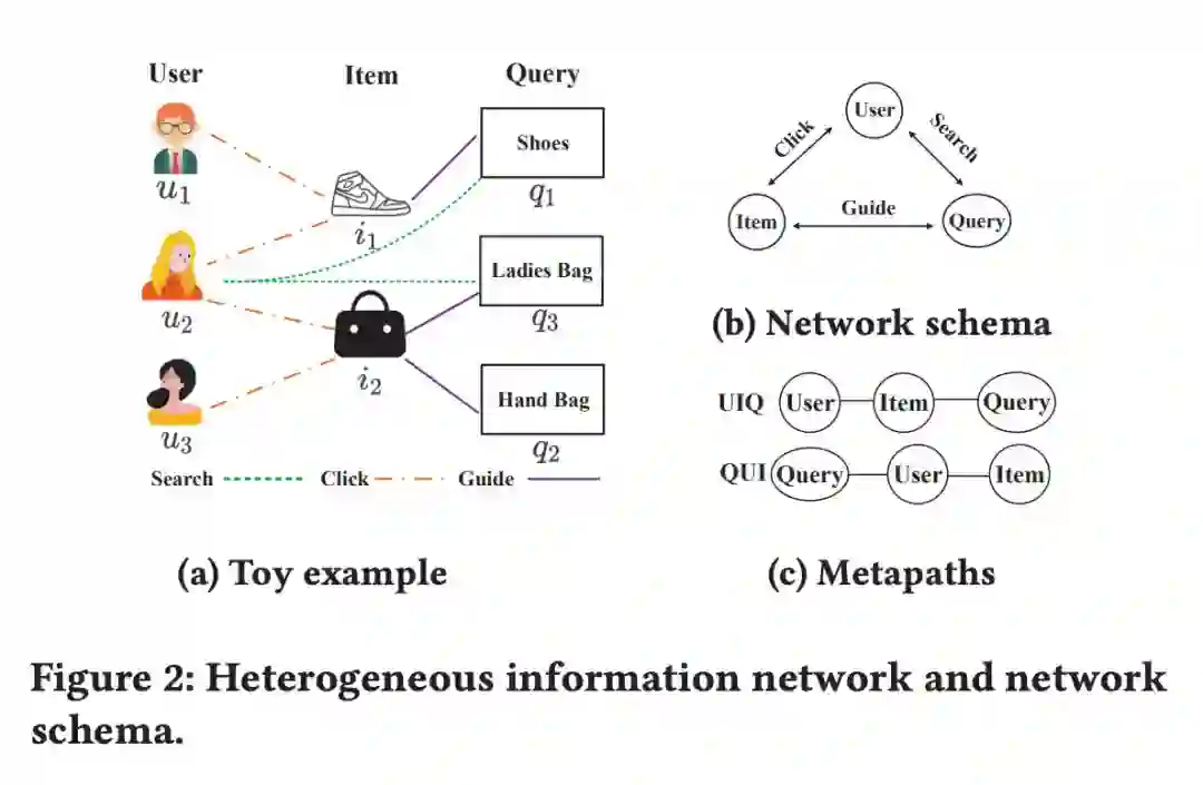 可以看出,作者选择了 QIU 和 IQU 两条元路径来学习 User 的表示,选择了 QIU 和 IUQ 来学习 Query 的表示。这里将异质图神经网络应用于推荐时⽐较自然的:淘宝的实际业务场景是天然的异质图,多条元路径可以更好地对节点进⾏描述。