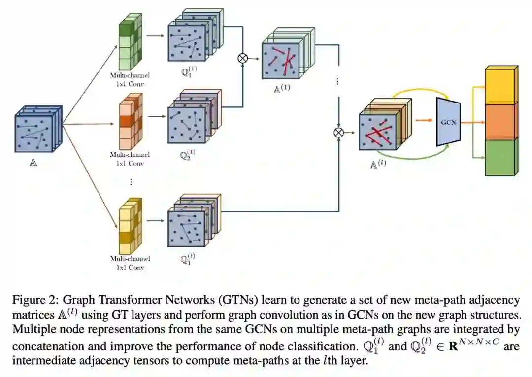 本文所提出的 Graph Transformer Networks 也遵循异质图神经网络的层次聚合。但是本文的重点并不在于聚合器的设计,⽽是解决异质图分析中的另⼀个重要问题:如何选取合适元路径?