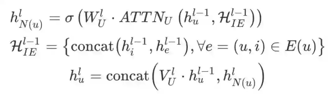 这里与上⾯⼏篇的聚合都所不同,作者引⼊了 User-Item 边上的评论信息作为边的特征。首先,聚合邻居信息更新边的表示